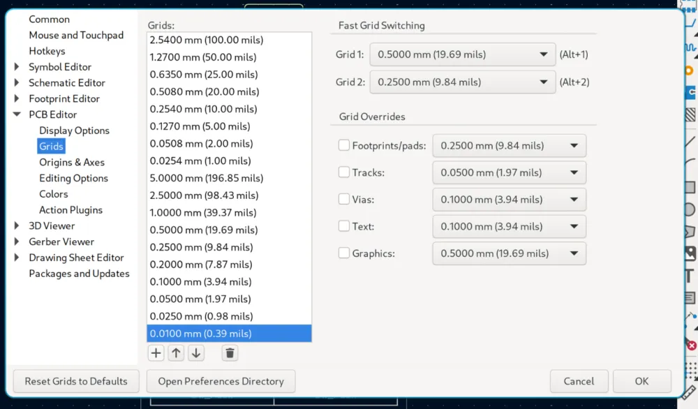 Select the button at the top that says "1.2700 mm (50 mils)". You can use this menu to change what grid you are on. Then click on Edit Grids...
