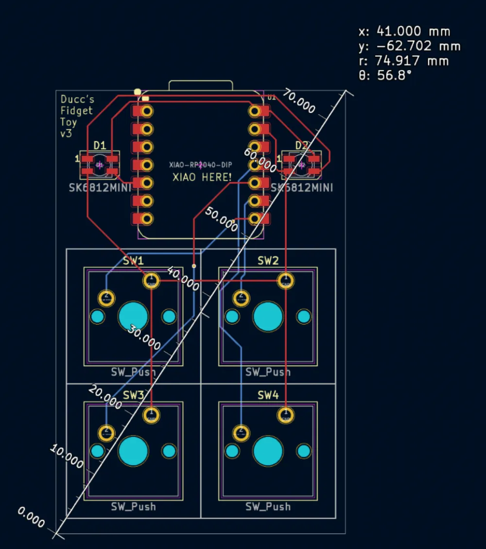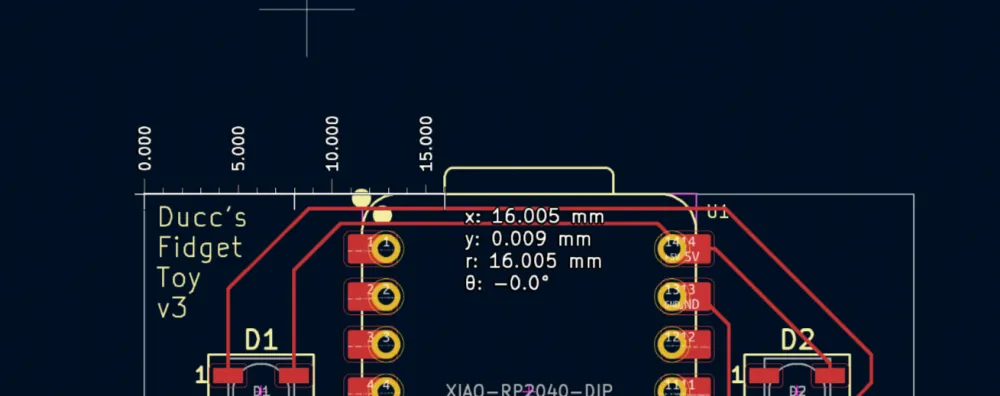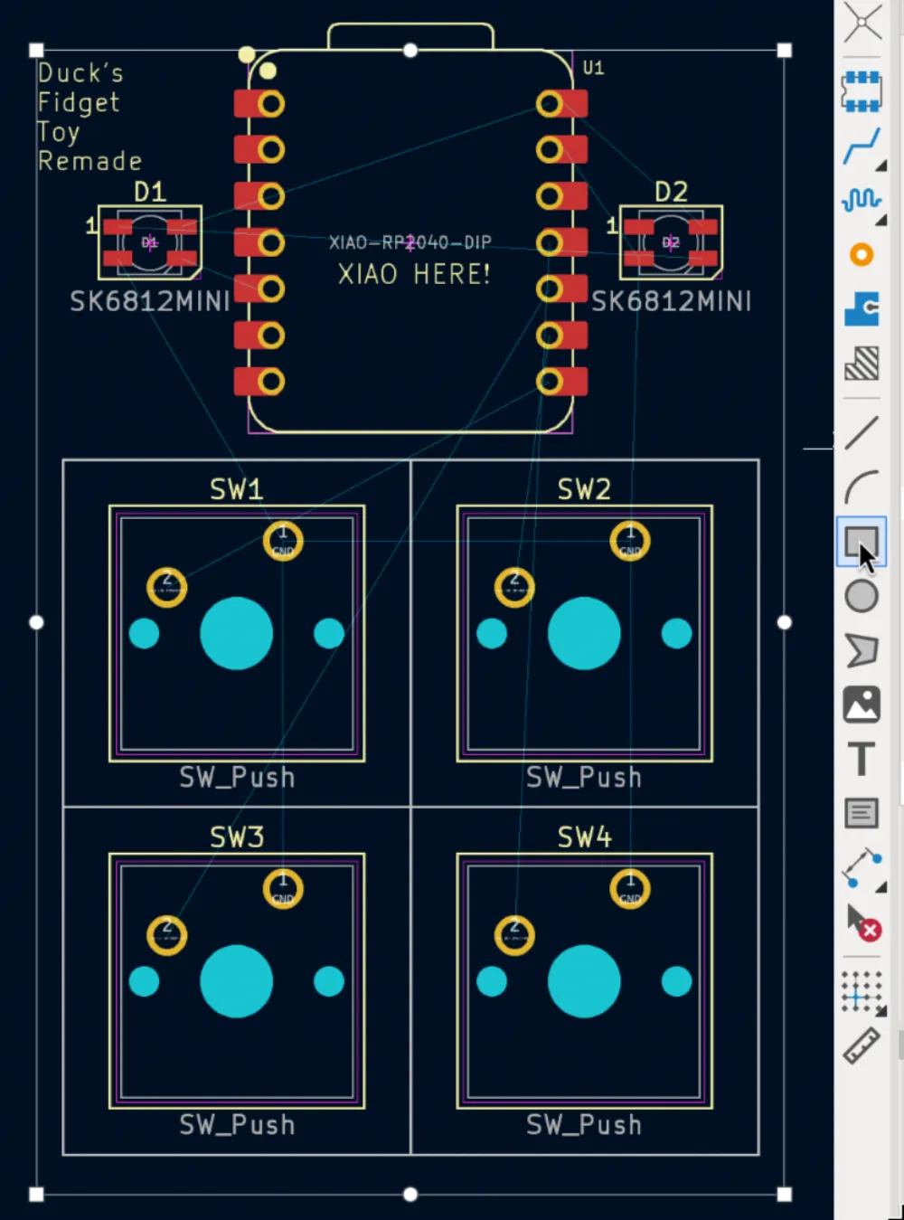 Also, it is VERY IMPORTANT that you brand your hackpad! Put the name of your hackpad on any silkscreen of your PCB. Do this by using the text tool. Also, write "XIAO HERE" on the side you would like your XIAO to be placed on.