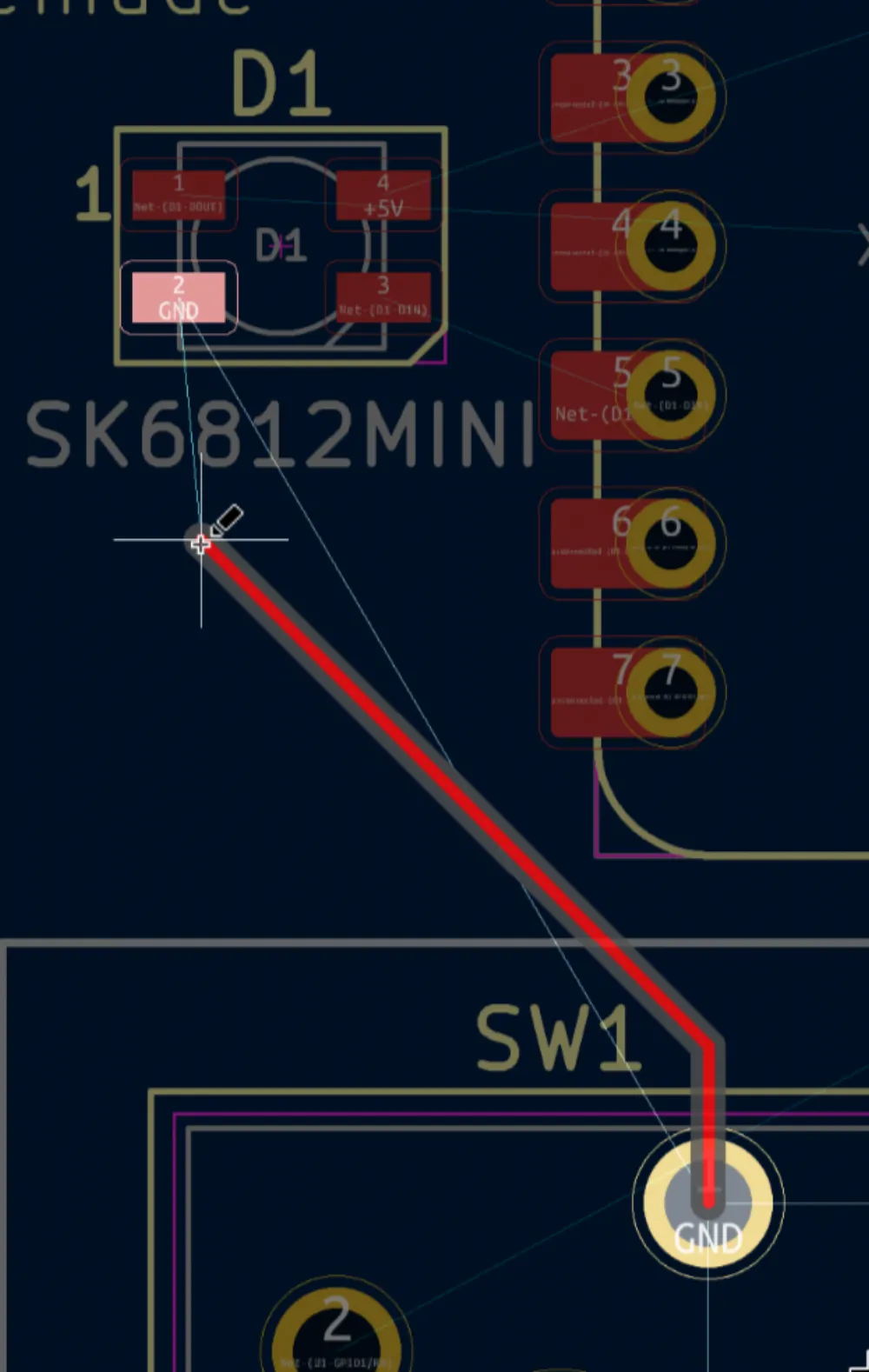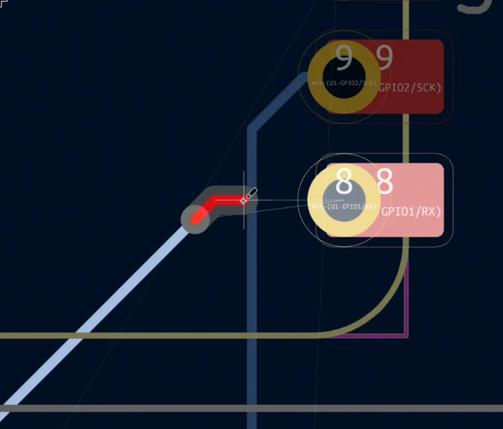 Now it's time to route the PCB! Hit X on your keyboard and hit any golden pad with a thin blue line poking out of it. It should dim the entire screen, show you which direction you need to go with a thin blue line and highlight the destination:
