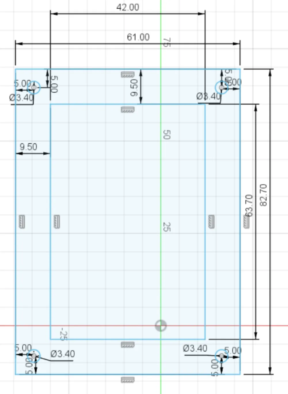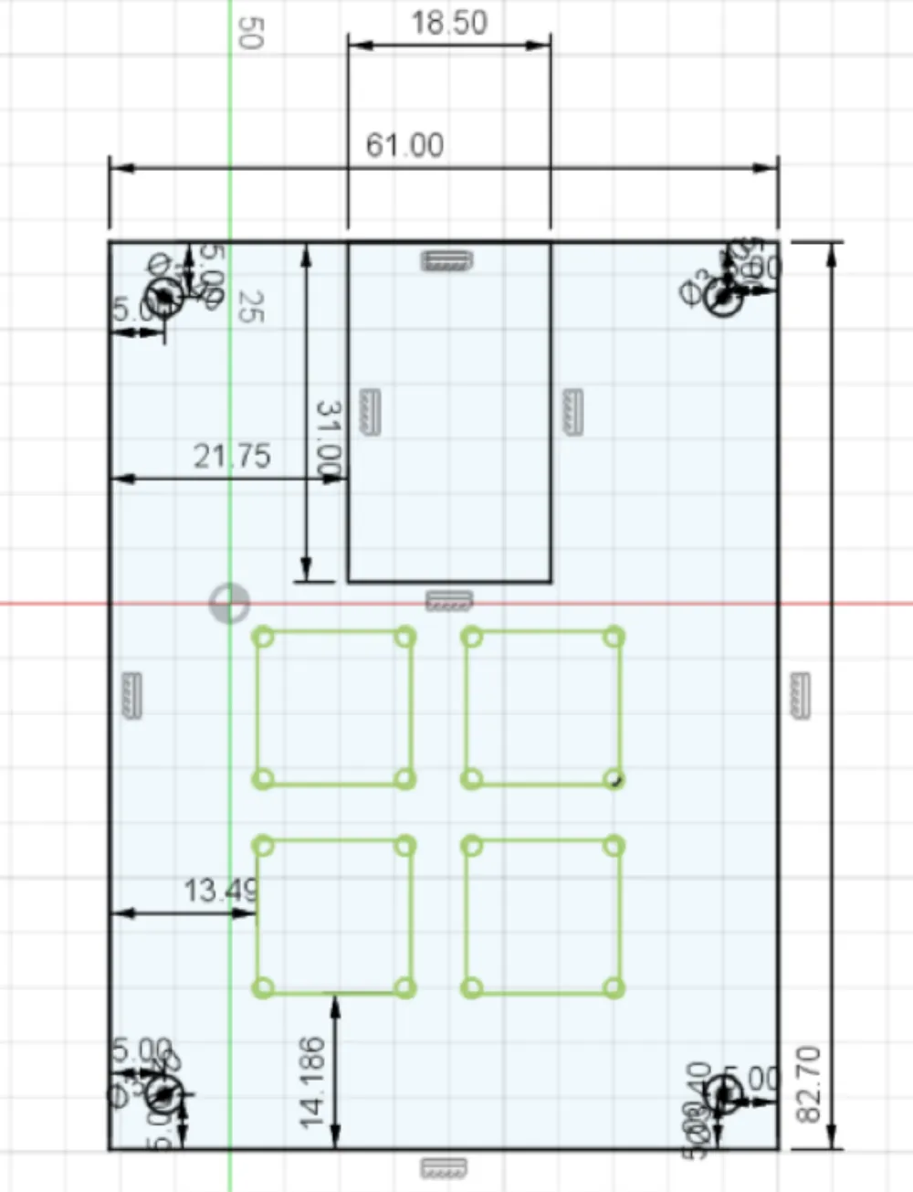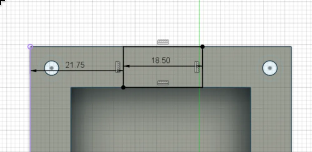 And create a new sketch (Create Sketch button). Draw a rectangle at the top, and place your starting point on the top edge, and ending point on the inner top edge. Now define it's width to 18.5mm (You can define it by clicking on the left edge, then the right edge with the distance tool). After that, set the distance from the left of the rectangle to the left edge of the case to xdistancein_kicad+5.75mm: