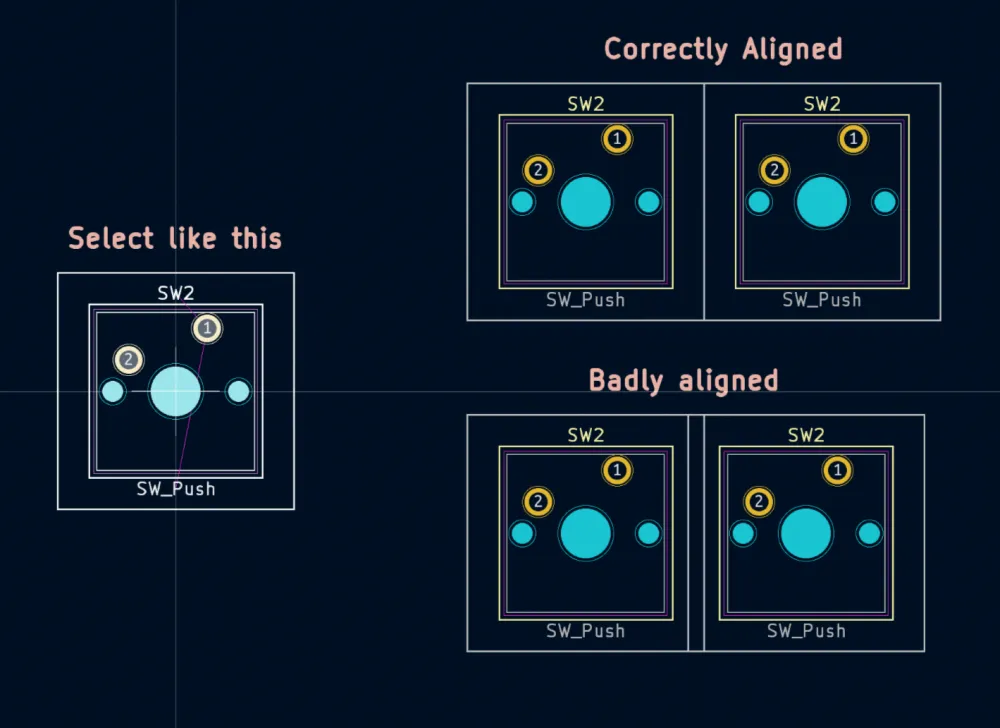 When placing the switches, I recommend you to use the newly defined grid of 2.38125 mm (Select it in the menu), and for placing other components, I recommend a grid of 0.10000 mm. Important: While moving the switches, select the blue circle at the center, this will make sure all the switches are alighed properly. You should align the outer while lines of the switches as so: