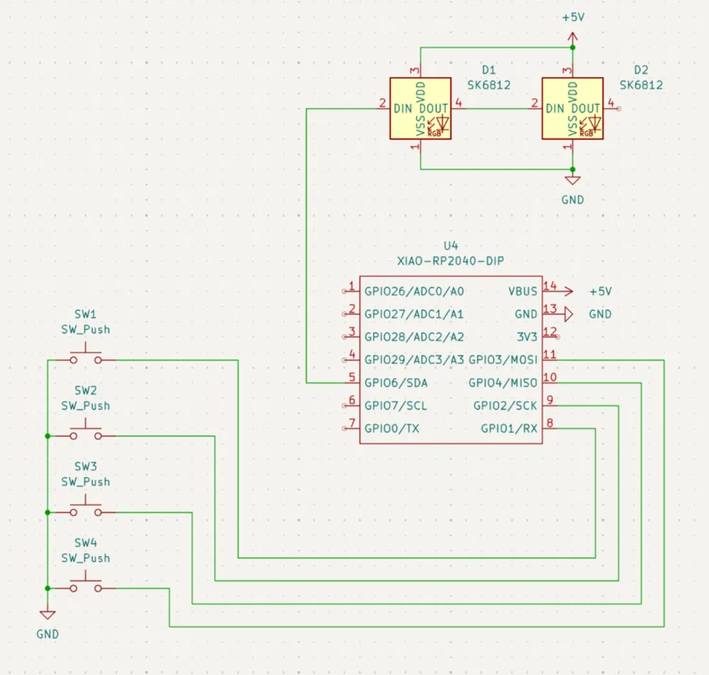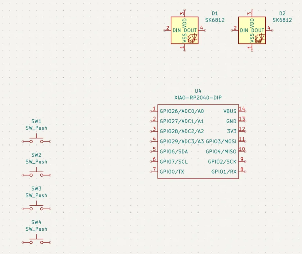 - SK6812 MINI LED (it's an RGB LED, also known as neopixels - I will be using 2 of these! We will be using the symbol named "SK6812" for these, as the SK6812MINI's symbol has the wrong pinout)