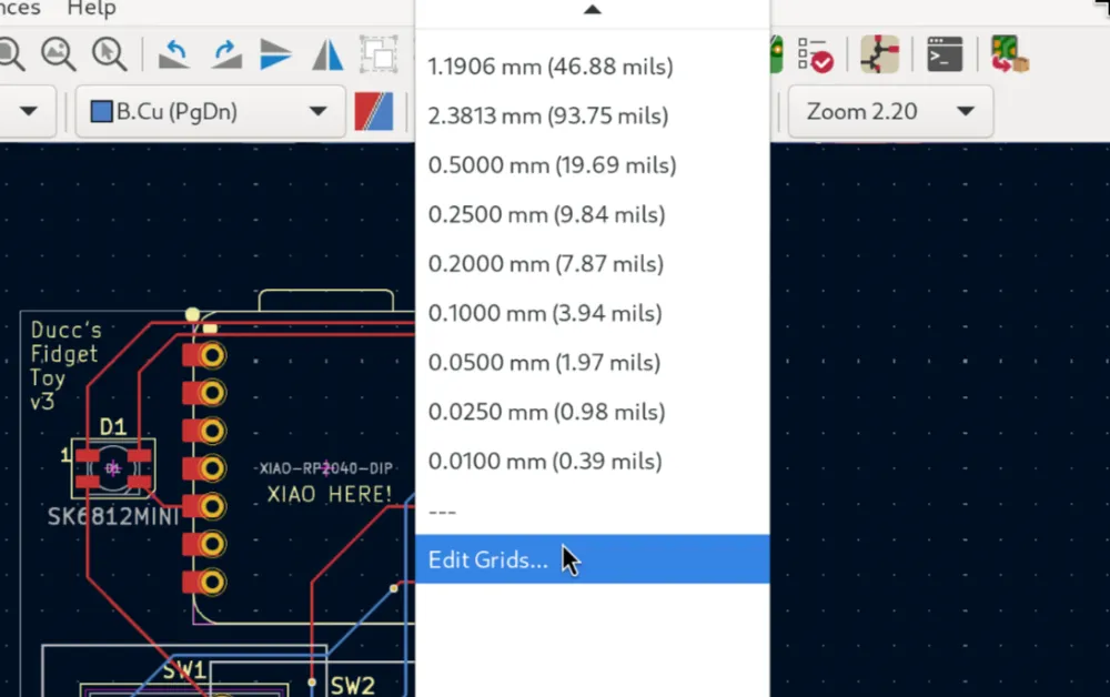 IMPORTANT! Remember to have the head of the XIAO poking out of the Edge.Cuts rectangle. This is mandatory to be able to plug your USB cable in.