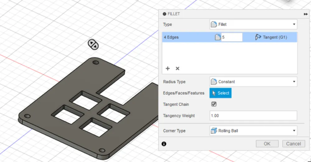 Right now our case looks a little ugly, it's so blocky! Lets round the vertical edges, press the Fillet button found in the top, click on each edge and make it 5mm. Should look as such: