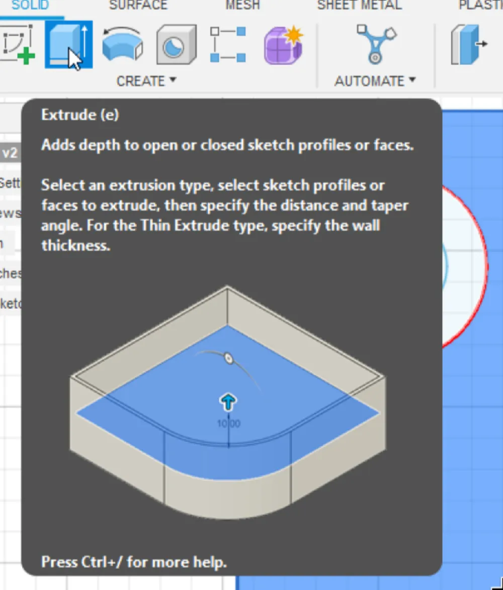 Click finish sketch, select the rectangle we just drew and press extrude. This time set the distance to -7.5mm