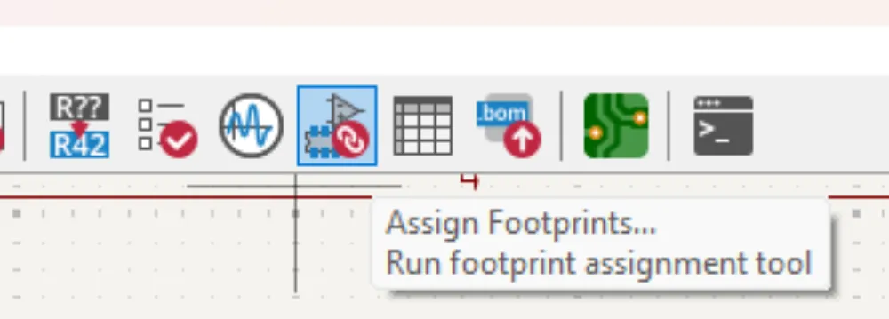 Once all the components are connected, we can start assigning footprints to the symbols we have here. Footprints are what gets physically drawn on the PCB. To do this, click the "run footprint assignment tool" in the top right.