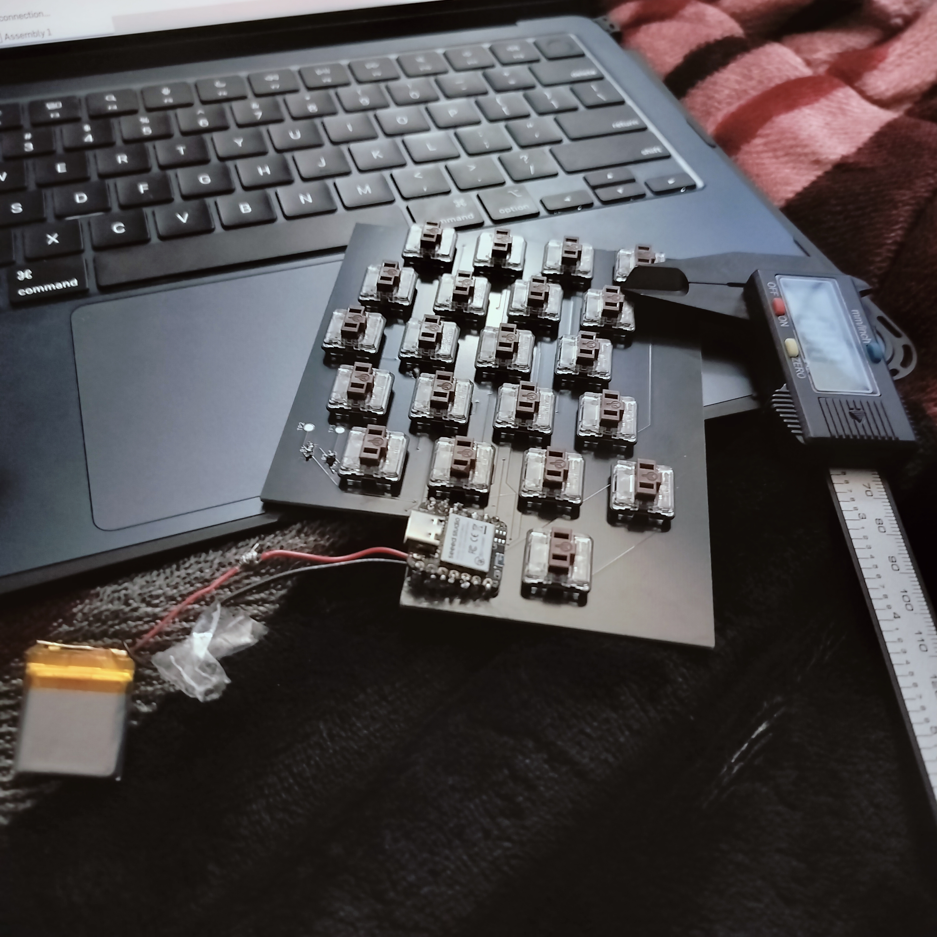 Started by soldering the xiao on the PCB after I took it off last time to find the bad connection and solder the battery before I put it on the PCB. I took two wires and tried to solder them so many times but they kept coming off. I got some pliers and bend the end of the wires to get more surface area. It took me 20 minutes to get the wires onto the xiao. Then I passed the wires through the holes on the PCB and and soldered the xiao on the PCB. Because I accidentally didn't use the through hole footprint I had to make like a mountain of solder to connect to the top of the xiao and make it actually work. After that was done I saw that the battery pads were already exposed on the other half of the keyboard so I pushed some wire and solder through and soldered it. I then took both battery and trimmed the wire a bit and then soldered them to the wires that were connected to the xiao pads. After a couple tries, it actually worked!!. Next I went and got my calipers and started measuring my Pcb. Since last time my case didn't work, I took the measurements all the dimensions I made the lid and made sure to include tolerances. I'm first going to print both bottoms of the cases and try the old top to save filament. This was a really good process to follow. Next time I will figure out Bluetooth and I think that should be it. I lastly put all the key caps on the keyboard and it looked so good! I then sliced a small part of the case to ensure fit and it was really good. I just sent the full part to get printed, hopefully it turns out good!