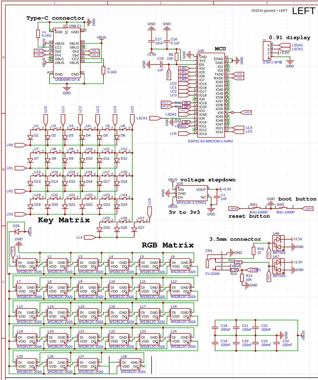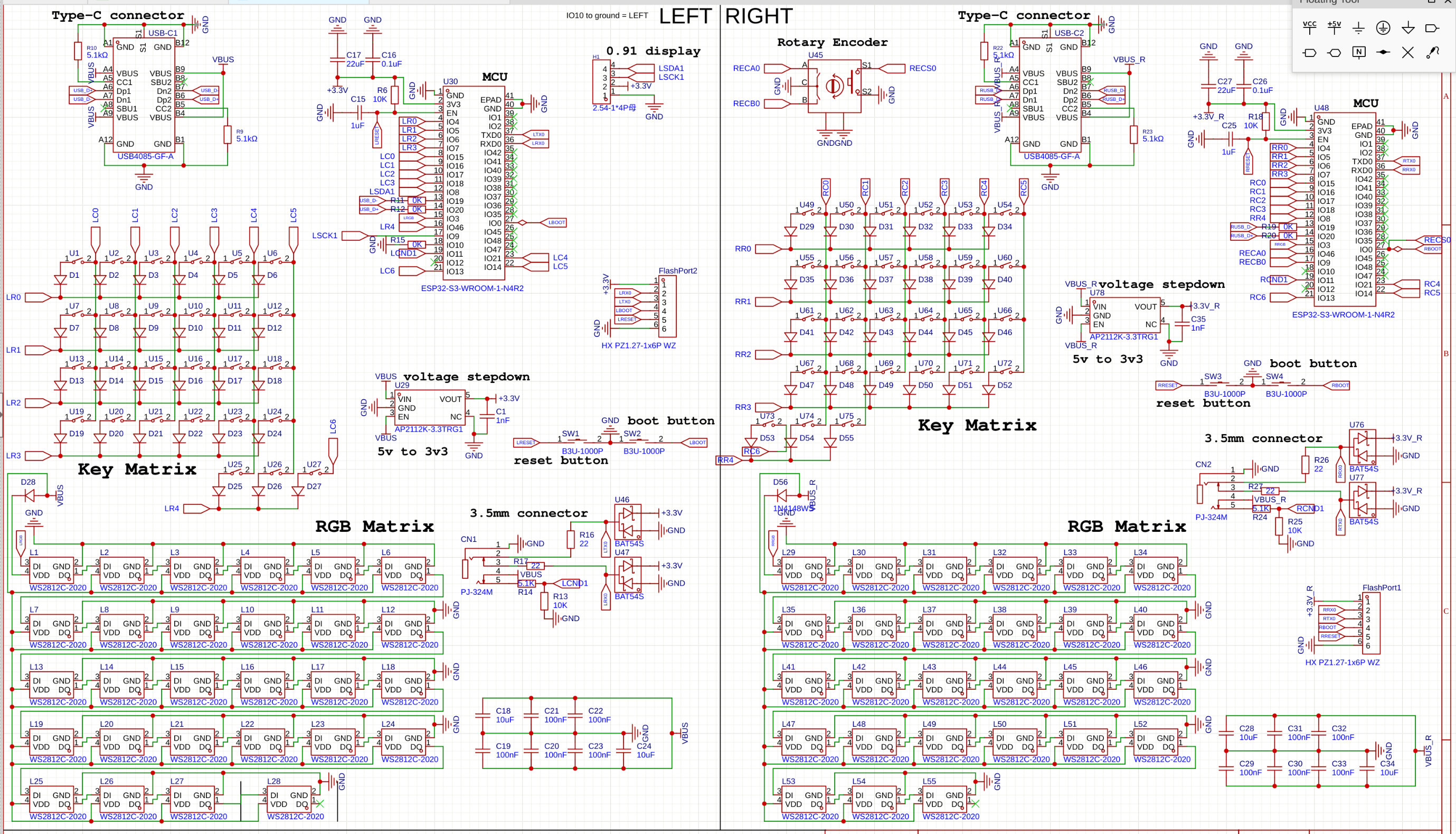 Today focused on refining the PCB design and schematics, primarily for the left half of the keyboard. A major part of the work involved researching protection mechanisms for the TRRS connection—specifically, how to prevent 5V shorts to the UART pins during hot-plugging, which is critical for protecting the MCU from high-voltage damage.