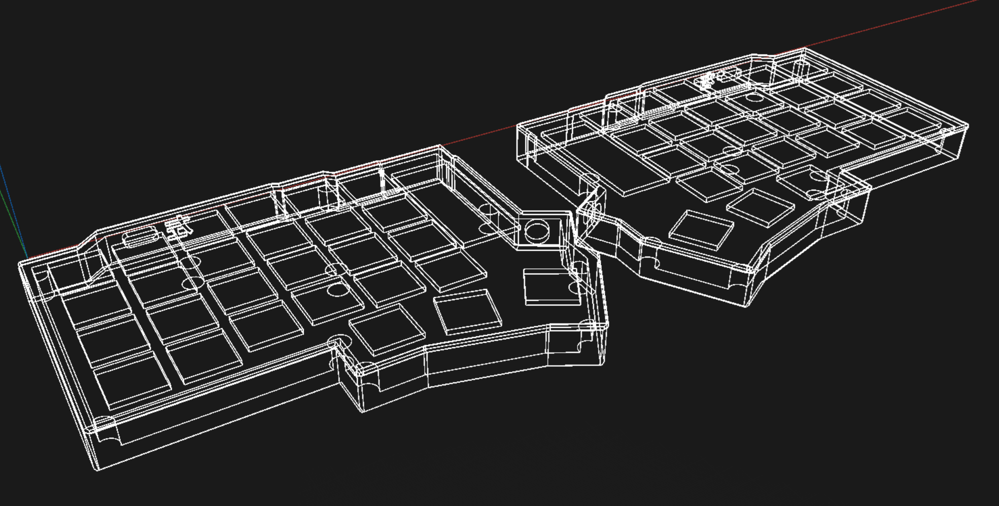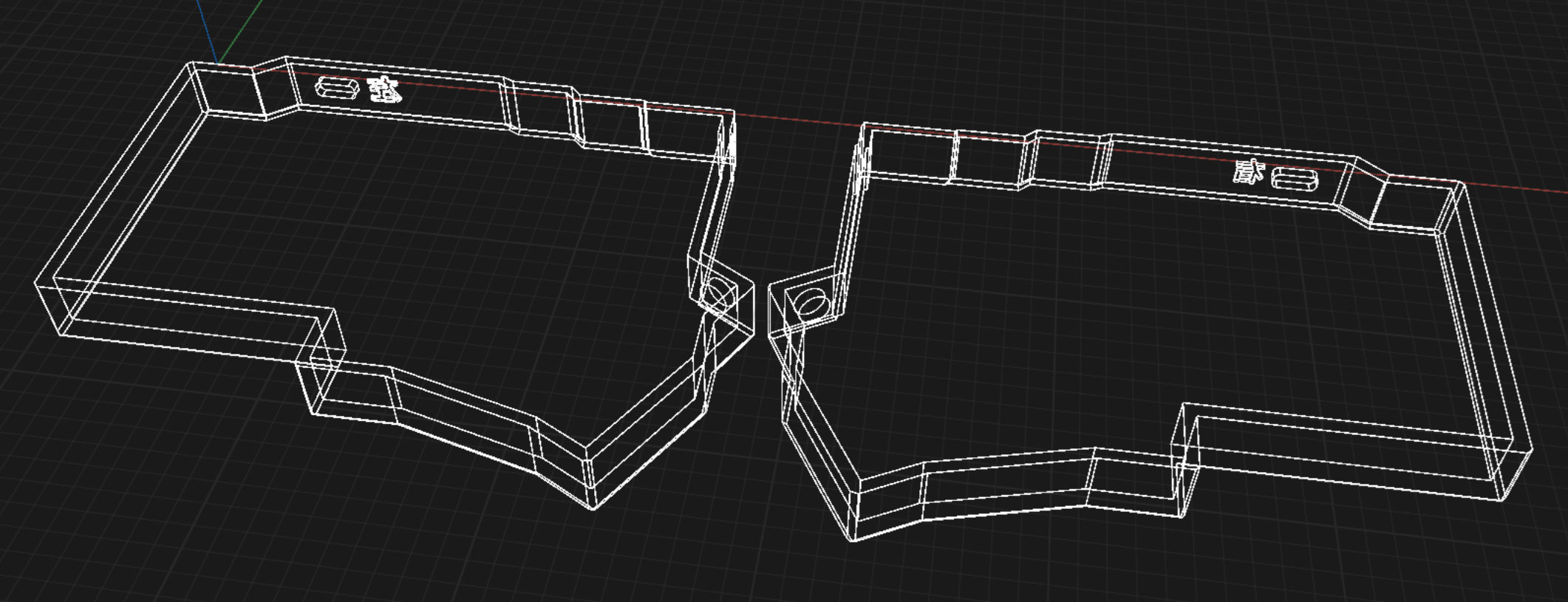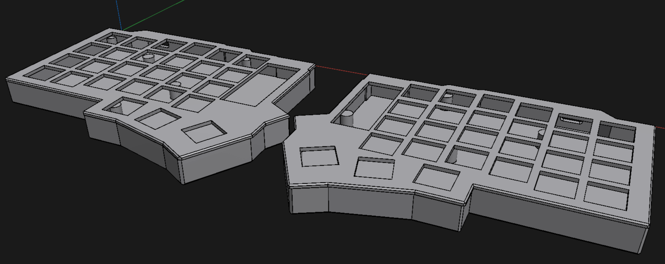 After procrastinating for a while, I finally decided to improve on the 3D models more. Added support cylinders to hold the PCBs in the right height, and made the plates where the switches will be mounted on! Now there are 4 models to be printed: Left case, Right case, Left plate and Right plate.