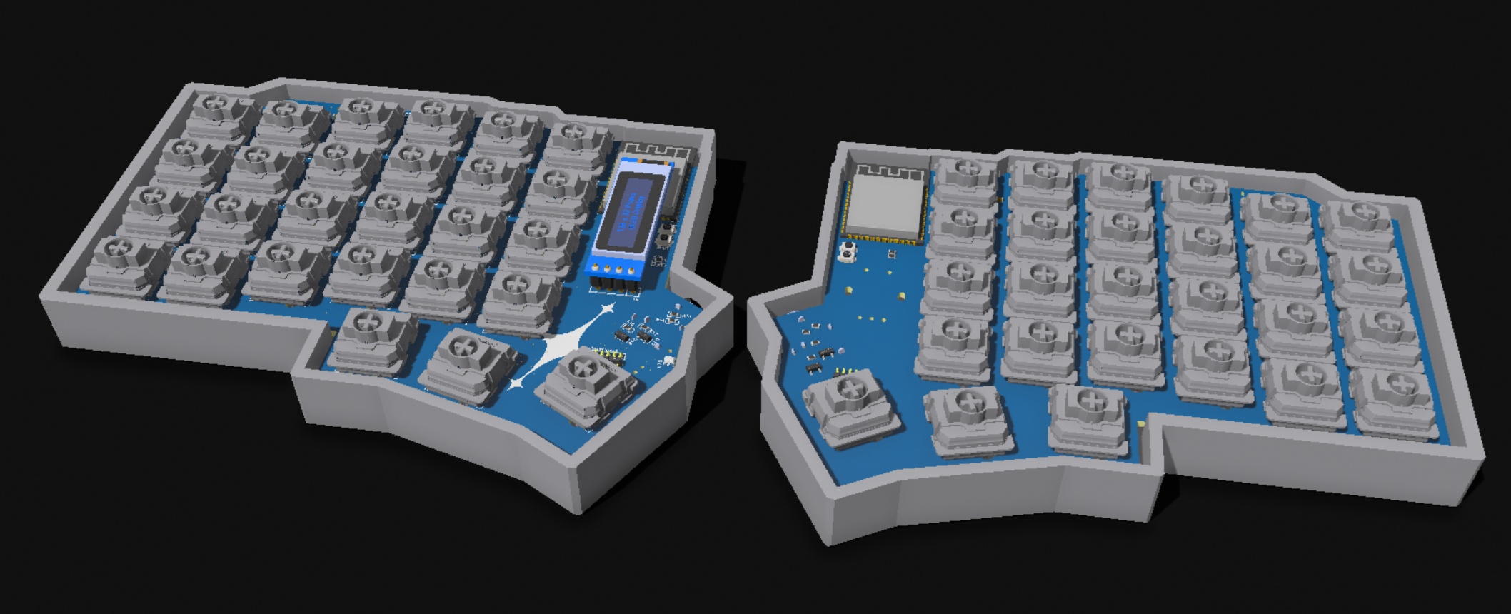 My first and very own Split Keyboard! A compact, ergonomic split keyboard designed for everyday typing and programming. Built using the ESP32-S3 microcontroller with KMK firmware, featuring per-key RGB underglow, an OLED display, and a rotary encoder! :D
