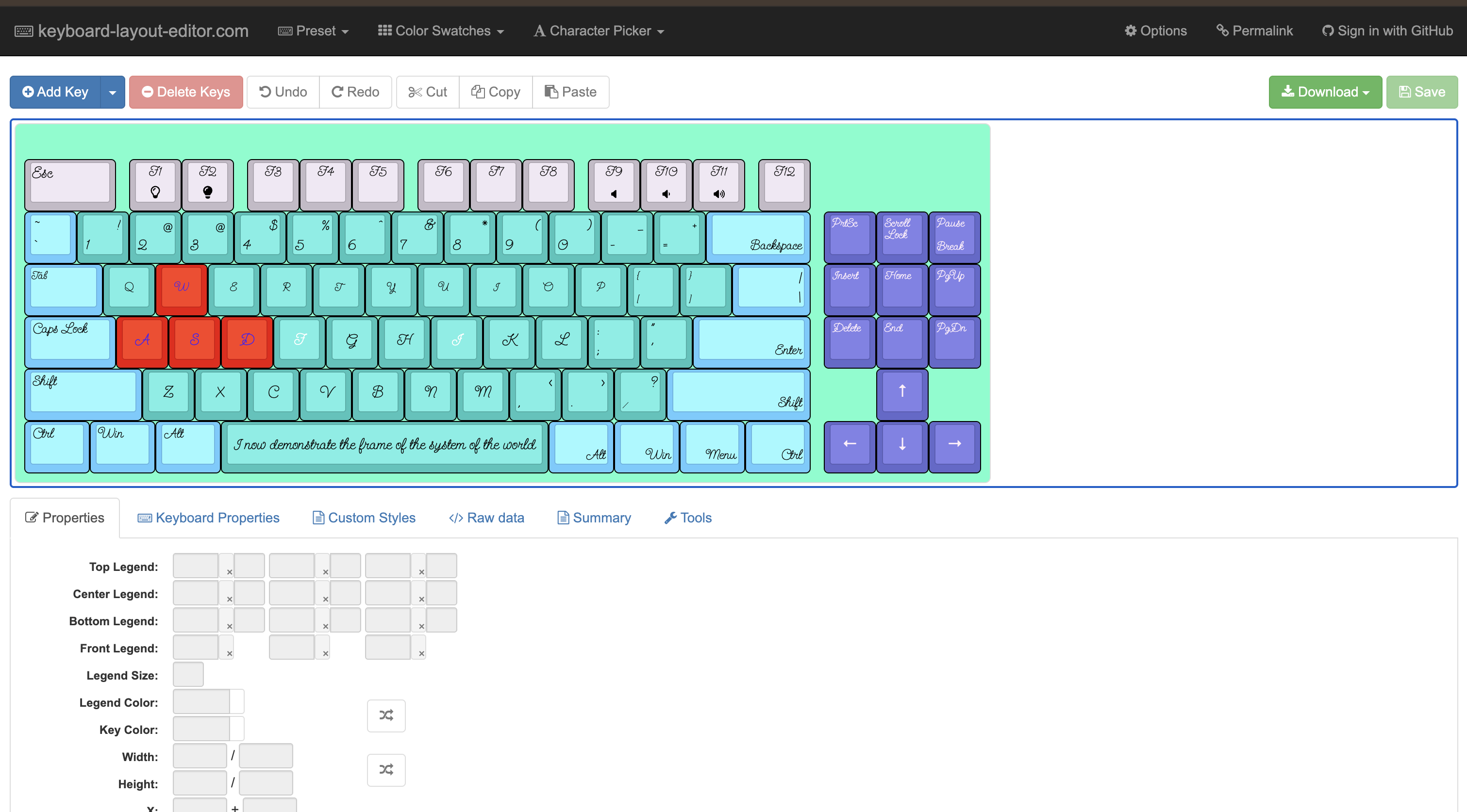 I have spent quite some time making my keboard design on the keyboard layout editor and I've made it happen. Here's the link https://www.keyboard-layout-editor.com/##@_backcolor=%2366ffcc&css=%2F@font-face%20%7B%0A%20%20font-family%2F:%20'Send%20Flowers'%2F%3B%0A%20%20font-style%2F:%20normal%2F%3B%0A%20%20font-weight%2F:%20400%2F%3B%0A%20%20font-display%2F:%20swap%2F%3B%0A%20%20src%2F:%20url(https%2F:%2F%2F%2F%2Ffonts.gstatic.com%2F%2Fs%2F%2Fsendflowers%2F%2Fv7%2F%2FIf2PXTjtZS-0Xqy13uCQSULfwALigOYlig.woff2)%20format('woff2')%2F%3B%0A%7D%0A%2F@import%20url('https%2F:%2F%2F%2F%2Ffonts.googleapis.com%2F%2Fcss2%3Ffamily%2F=Send+Flowers%2F&display%2F=swap')%2F%3B%0A*%20%7B%20font-family%2F:%20'Send%20Flowers'%2F%3B%20%7D%0A%0A.icon-speaker-no%2F:after%20%7B%0A%20%20%2F%2F*%20This%20pseudo-element%20renders%20the%20icon%20*%2F%2F%0A%20%20content%2F:%20'%5C00a0'%2F%3B%20%0A%20%20display%2F:%20inline-block%2F%3B%20%0A%20%20width%2F:%201em%2F%3B%20%0A%20%20height%2F:%201em%2F%3B%20%0A%20%20%0A%20%20%2F%2F*%20The%20SVG%20data%20*%2F%2F%0A%20%20background-image%2F:%20url(%22data%2F:image%2F%2Fsvg+xml%2F%3Bcharset%2F=utf-8,%3Csvg%20xmlns%2F='http%2F:%2F%2F%2F%2Fwww.w3.org%2F%2F2000%2F%2Fsvg'%20viewBox%2F='0%200%20640%20640'%3E%3Cpath%20d%2F='M256%20416L208%20416C181.5%20416%20160%20394.5%20160%20368L160%20272C160%20245.5%20181.5%20224%20208%20224L256%20224L390.1%20104.8C396.5%2099.1%20404.7%2096%20413.2%2096C432.4%2096%20448%20111.6%20448%20130.8L448%20509.2C448%20528.4%20432.4%20544%20413.2%20544C404.7%20544%20396.5%20540.9%20390.1%20535.2L256%20416z'%2F%2F%3E%3C%2F%2Fsvg%3E%22)%2F%3B%0A%20%20%0A%20%20background-repeat%2F:%20no-repeat%2F%3B%0A%20%20background-position%2F:%20center%2F%3B%0A%20%20background-size%2F:%20contain%2F%3B%0A%7D%0A%0A.icon-speaker-low%2F:after%20%7B%0A%20%20content%2F:%20'%5C00a0'%2F%3B%20%0A%20%20display%2F:%20inline-block%2F%3B%20%0A%20%20width%2F:%201em%2F%3B%20%0A%20%20height%2F:%201em%2F%3B%20%0A%20%20%0A%20%20%2F%2F*%20The%20SVG%20data%20*%2F%2F%0A%20%20background-image%2F:%20url(%22data%2F:image%2F%2Fsvg+xml%2F%3Bcharset%2F=utf-8,%3Csvg%20xmlns%2F='http%2F:%2F%2F%2F%2Fwww.w3.org%2F%2F2000%2F%2Fsvg'%20viewBox%2F='0%200%20640%20640'%3E%3Cpath%20d%2F='M144%20416L192%20416L326.1%20535.2C332.5%20540.9%20340.7%20544%20349.2%20544C368.4%20544%20384%20528.4%20384%20509.2L384%20130.8C384%20111.6%20368.4%2096%20349.2%2096C340.7%2096%20332.5%2099.1%20326.1%20104.8L192%20224L144%20224C117.5%20224%2096%20245.5%2096%20272L96%20368C96%20394.5%20117.5%20416%20144%20416zM476.6%20245.5C466.3%20237.1%20451.2%20238.7%20442.8%20249C434.4%20259.3%20436%20274.4%20446.3%20282.8C457.1%20291.6%20464%20305%20464%20320C464%20335%20457.1%20348.4%20446.3%20357.3C436%20365.7%20434.5%20380.8%20442.8%20391.1C451.1%20401.4%20466.3%20402.9%20476.6%20394.6C498.1%20376.9%20512%20350.1%20512%20320C512%20289.9%20498.1%20263.1%20476.5%20245.5z'%2F%2F%3E%3C%2F%2Fsvg%3E%22)%2F%3B%0A%20%20%0A%20%20background-repeat%2F:%20no-repeat%2F%3B%0A%20%20background-position%2F:%20center%2F%3B%0A%20%20background-size%2F:%20contain%2F%3B%0A%7D%0A%0A.icon-speaker-high%2F:after%20%7B%0A%20%20content%2F:%20'%5C00a0'%2F%3B%20%0A%20%20display%2F:%20inline-block%2F%3B%20%0A%20%20width%2F:%201em%2F%3B%20%0A%20%20height%2F:%201em%2F%3B%20%0A%20%20%0A%20%20%2F%2F*%20The%20SVG%20data%20*%2F%2F%0A%20%20background-image%2F:%20url(%22data%2F:image%2F%2Fsvg+xml%2F%3Bcharset%2F=utf-8,%3Csvg%20xmlns%2F='http%2F:%2F%2F%2F%2Fwww.w3.org%2F%2F2000%2F%2Fsvg'%20viewBox%2F='0%200%20640%20640'%3E%3Cpath%20d%2F='M533.6%2096.5C523.3%2088.1%20508.2%2089.7%20499.8%20100C491.4%20110.3%20493%20125.4%20503.3%20133.8C557.5%20177.8%20592%20244.8%20592%20320C592%20395.2%20557.5%20462.2%20503.3%20506.3C493%20514.7%20491.5%20529.8%20499.8%20540.1C508.1%20550.4%20523.3%20551.9%20533.6%20543.6C598.5%20490.7%20640%20410.2%20640%20320C640%20229.8%20598.5%20149.2%20533.6%2096.5zM473.1%20171C462.8%20162.6%20447.7%20164.2%20439.3%20174.5C430.9%20184.8%20432.5%20199.9%20442.8%20208.3C475.3%20234.7%20496%20274.9%20496%20320C496%20365.1%20475.3%20405.3%20442.8%20431.8C432.5%20440.2%20431%20455.3%20439.3%20465.6C447.6%20475.9%20462.8%20477.4%20473.1%20469.1C516.3%20433.9%20544%20380.2%20544%20320.1C544%20260%20516.3%20206.3%20473.1%20171.1zM412.6%20245.5C402.3%20237.1%20387.2%20238.7%20378.8%20249C370.4%20259.3%20372%20274.4%20382.3%20282.8C393.1%20291.6%20400%20305%20400%20320C400%20335%20393.1%20348.4%20382.3%20357.3C372%20365.7%20370.5%20380.8%20378.8%20391.1C387.1%20401.4%20402.3%20402.9%20412.6%20394.6C434.1%20376.9%20448%20350.1%20448%20320C448%20289.9%20434.1%20263.1%20412.6%20245.5zM80%20416L128%20416L262.1%20535.2C268.5%20540.9%20276.7%20544%20285.2%20544C304.4%20544%20320%20528.4%20320%20509.2L320%20130.8C320%20111.6%20304.4%2096%20285.2%2096C276.7%2096%20268.5%2099.1%20262.1%20104.8L128%20224L80%20224C53.5%20224%2032%20245.5%2032%20272L32%20368C32%20394.5%2053.5%20416%2080%20416z'%2F%2F%3E%3C%2F%2Fsvg%3E%22)%2F%3B%0A%20%20%0A%20%20background-repeat%2F:%20no-repeat%2F%3B%0A%20%20background-position%2F:%20center%2F%3B%0A%20%20background-size%2F:%20contain%2F%3B%0A%7D%0A%0A.icon-lightbulb%2F:after%20%7B%0A%20%20content%2F:%20'%5C00a0'%2F%3B%20%0A%20%20display%2F:%20inline-block%2F%3B%20%0A%20%20width%2F:%201em%2F%3B%20%0A%20%20height%2F:%201em%2F%3B%20%0A%20%20%0A%20%20%2F%2F*%20The%20SVG%20data%20*%2F%2F%0A%20%20background-image%2F:%20url(%22data%2F:image%2F%2Fsvg+xml%2F%3Bcharset%2F=utf-8,%3Csvg%20xmlns%2F='http%2F:%2F%2F%2F%2Fwww.w3.org%2F%2F2000%2F%2Fsvg'%20viewBox%2F='0%200%20640%20640'%3E%3Cpath%20d%2F='M424.5%20355.1C449%20329.2%20464%20294.4%20464%20256C464%20176.5%20399.5%20112%20320%20112C240.5%20112%20176%20176.5%20176%20256C176%20294.4%20191%20329.2%20215.5%20355.1C236.8%20377.5%20260.4%20409.1%20268.8%20448L371.2%20448C379.6%20409%20403.2%20377.5%20424.5%20355.1zM459.3%20388.1C435.7%20413%20416%20443.4%20416%20477.7L416%20496C416%20540.2%20380.2%20576%20336%20576L304%20576C259.8%20576%20224%20540.2%20224%20496L224%20477.7C224%20443.4%20204.3%20413