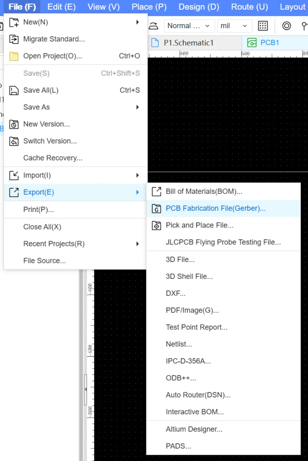 File>Export>PCB Fabrication File(Gerber).