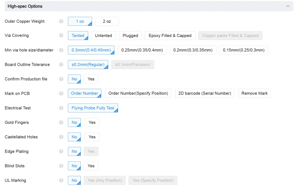 PCB fabs have a lot of settings for board manufacturing, and JLCPCB is no exception. Here’s a rundown on what each section means: