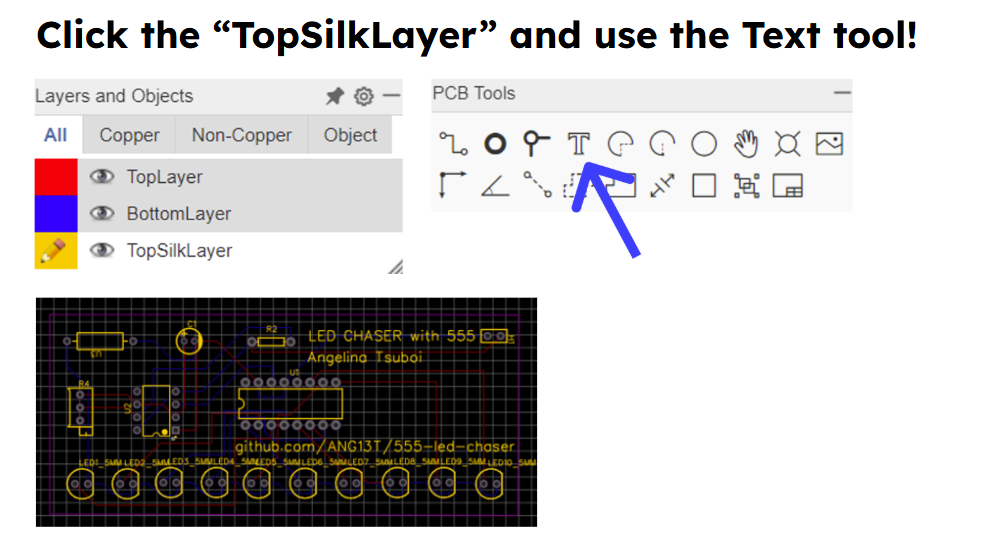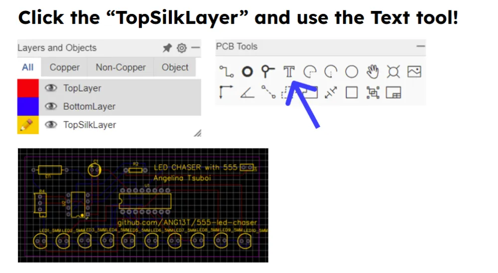 You may have already added some text and art to customize your board. if not, you can click “TopSilkLayer” and use the text tool.