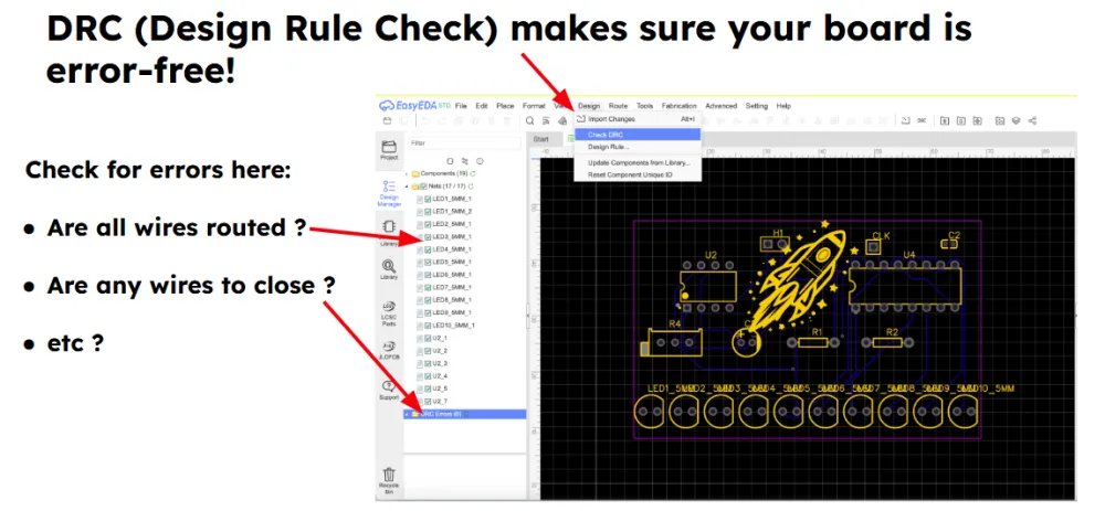 This runs a script which makes sure that your board has no interference errors, no components are off the board, and no wires are intersecting. It does not however confirm that your board works.