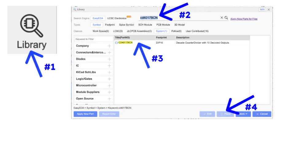 In order to place components (aka symbols), you need to click “Library” and search for a component number such as “CD4017BCN”.