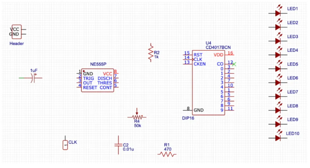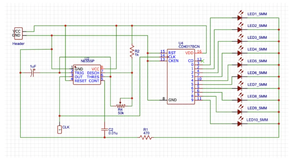We will all build this LED chaser which blinks 10 LEDs in a variable speed sequence.