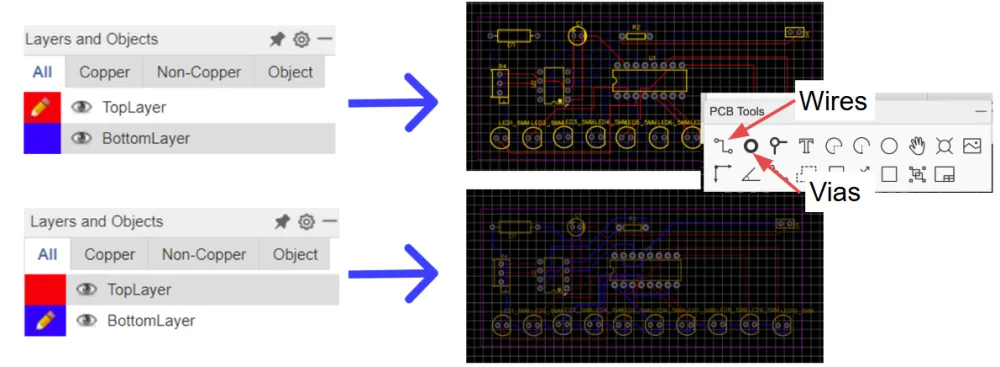 On the side bar, you can choose either top layer (red) or bottom layer (blue), or a combination of both to wire your components.