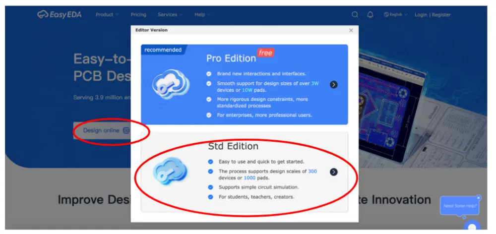 Go to easyeda.com/editor and click Design Online > STD edition. We are using the standard edition for simplicity sake but the pro edition is nice and its free!