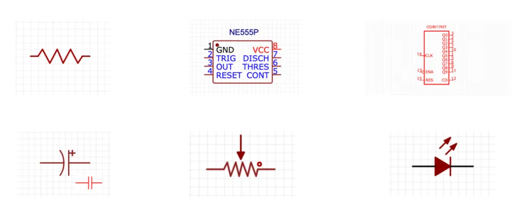 In schematic, things are represented as symbols. Here are the symbols for the components above: