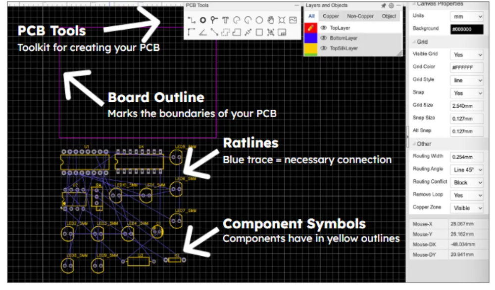 Once you have your board outline, you need to organize and wire your components. You should get familiar with the PCB tools: