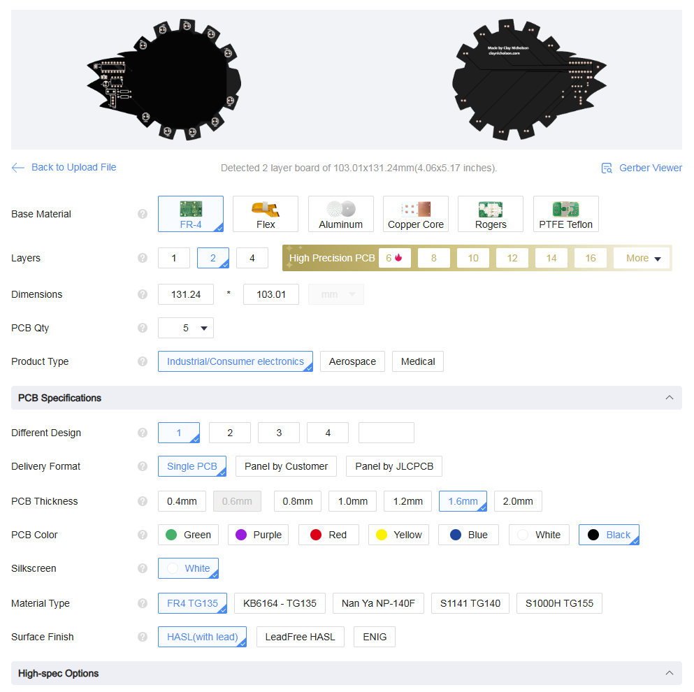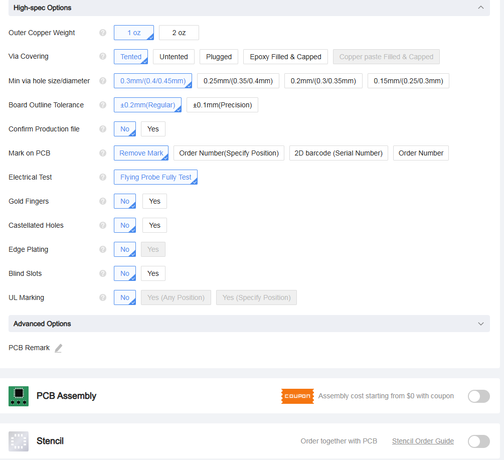 For high-spec options, also keep the default. Do not click PCB assembly as we will give you a kit to hand-solder your board.