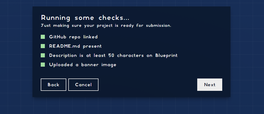 Blueprint will run some checks. If any are red, you need to fix them. (you may need to upload your project banner)