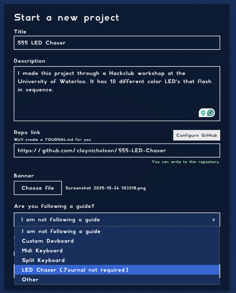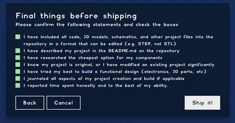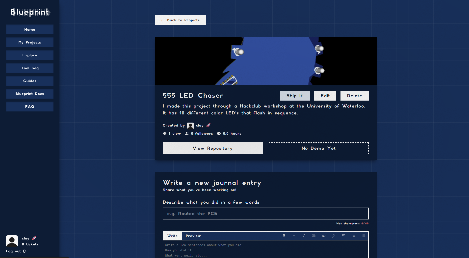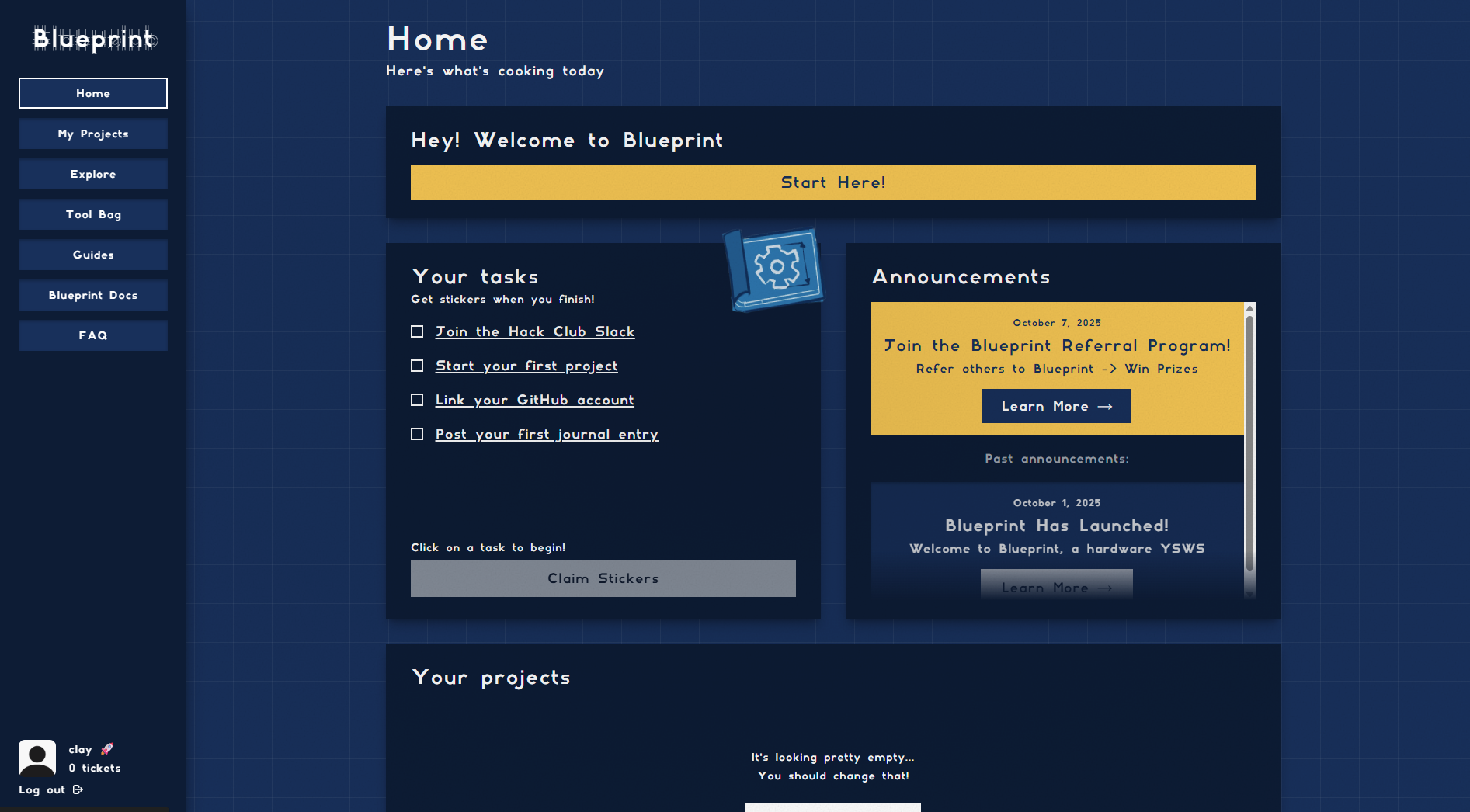 Check out more Blueprint projects on https://blueprint.hackclub.com/explore! You can also make any hardware project you want on Blueprint, and get up to $400 to make it. For future Blueprint projects, you will need to make a journal throughout your development process. Again, if you have any questions, ask in #blueprint-suppport on Slack.