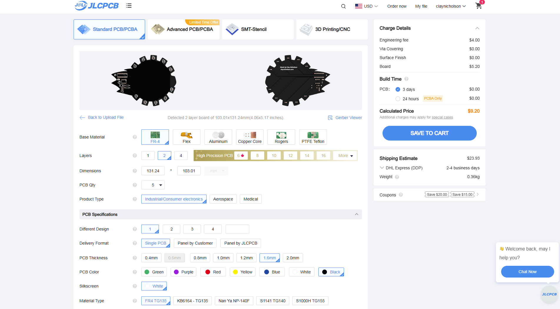 You should keep the default settings for everything. The only thing you should/can change is the PCB Color. I did black as seen below: