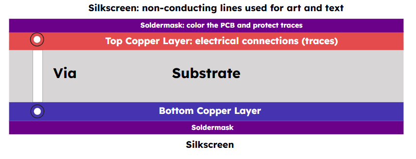A PCB is made out of multiple layers. Our boards are “two layer” meaning that they have two layers of copper wire.